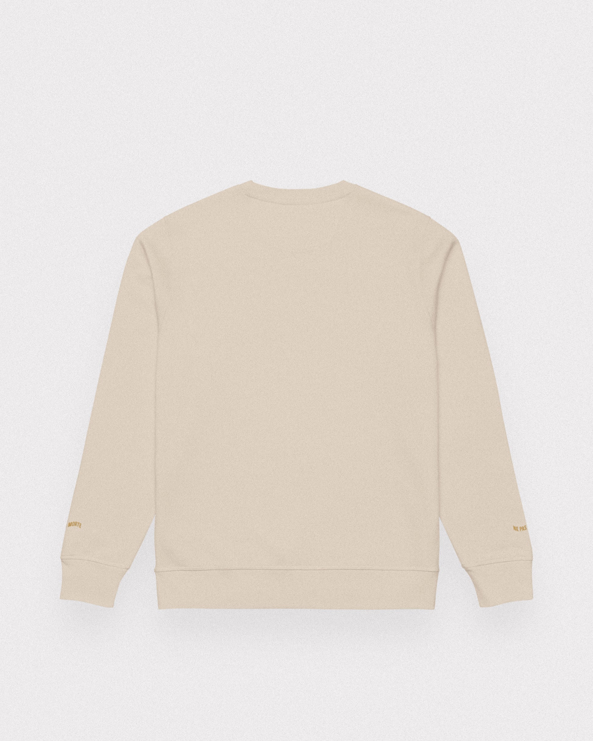 Cozy but make it epic. 🐎✨ This beige equestrian-inspired sweater shows a tiny horse rider trekking toward Mount Croissant. The sleeves are embroidered with the French phrase “Ne pas y aller de main morte”, meaning give it 100%.